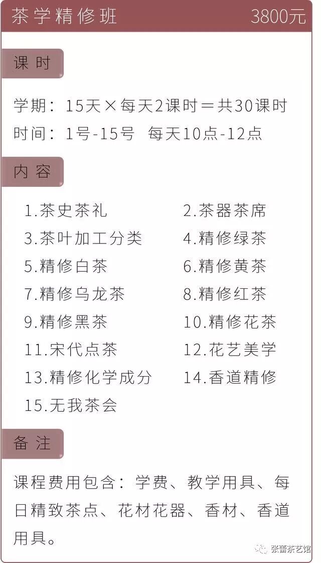 【張蕾茶藝館】茶學(xué)精修班每月一期,每期新班一號(hào)開(kāi)課。所有學(xué)員報(bào)名起一年內(nèi)完成所報(bào)課程,一年內(nèi)可享受免費(fèi)重聽(tīng)機(jī)會(huì)。期待各位茶藝愛(ài)好者的加入,一起走進(jìn)中國(guó)茶文化。