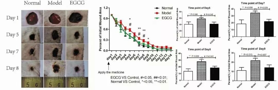 EGCG處理組小鼠的傷口愈合率較模型組提高約為18%,接近正常組小鼠愈合率。