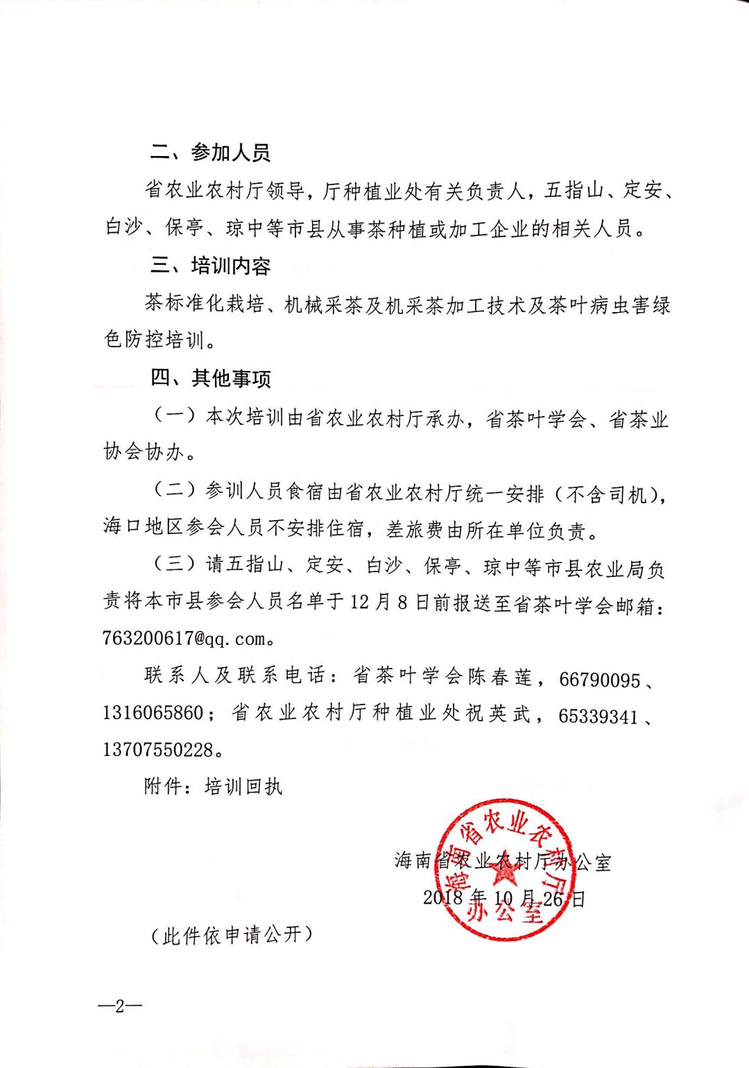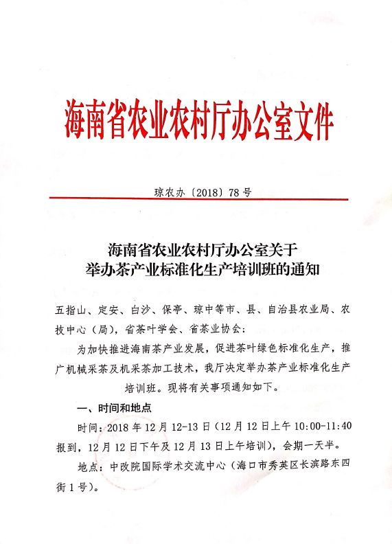 為加快推進(jìn)海南茶產(chǎn)業(yè)發(fā)展,促進(jìn)茶葉綠色標(biāo)準(zhǔn)化生產(chǎn),推廣機(jī)械采茶及機(jī)采茶加工技術(shù),我廳決定舉辦茶產(chǎn)業(yè)標(biāo)準(zhǔn)化生產(chǎn)培訓(xùn)班?,F(xiàn)將有關(guān)事項(xiàng)通知如下。