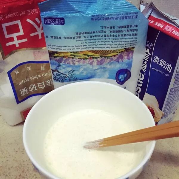 倒適量淡奶油(可以選擇雀巢淡奶油),里面加一點糖、加一點鹽,拌一拌,嘗一下,再根據(jù)個人口味調(diào)出喜愛的口感;